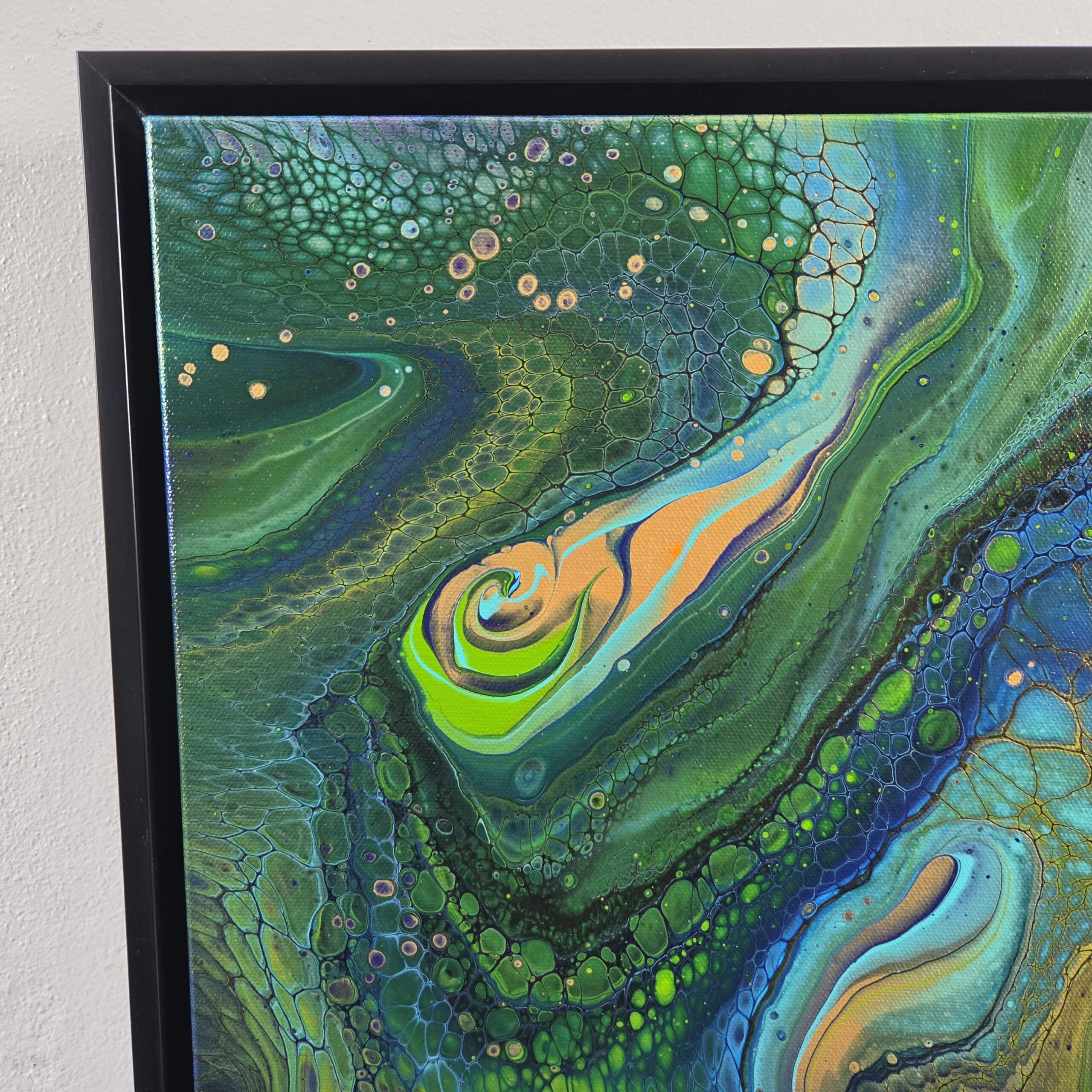 Acrylic paint on canvas utilizing the swipe technique method. Paints are made fluid and then manipulated with a palette knife to create the design. This is a creation of Molly’s Artistry, an abstract artist.