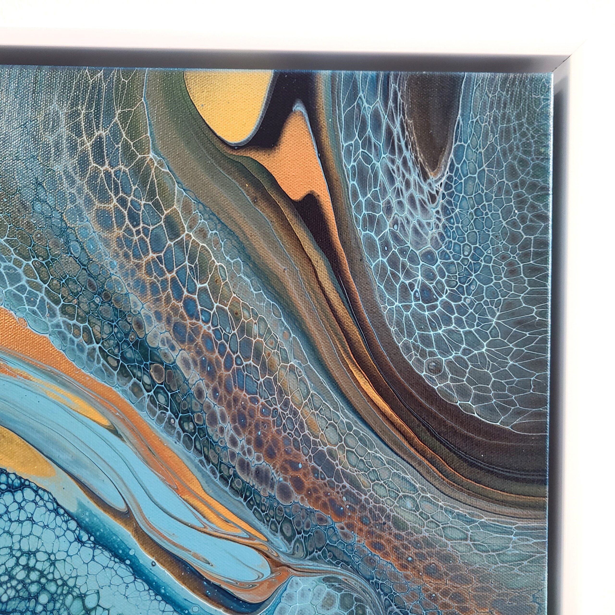 Soft turquoise and orange painting in the wrecked ring pour design. Gold shimmer and highlights throughout.