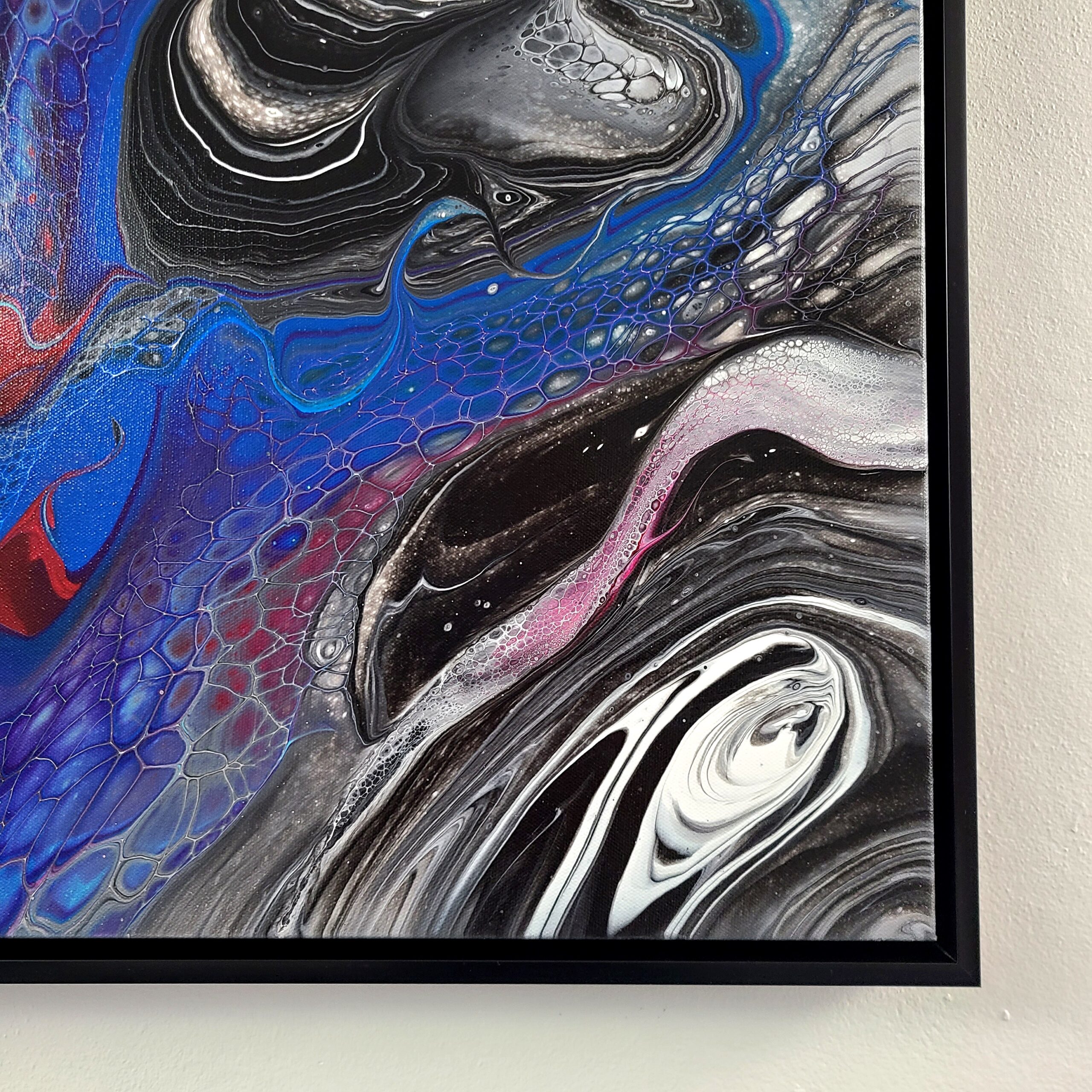 Created with acrylic paint on canvas utilizing a combination of ring pour and swipe technique. Paints are made fluid and then manipulated with a palette knife and tilted to create the design. This is a creation of Molly’s Artistry, an abstract fluid artist and online social personality.